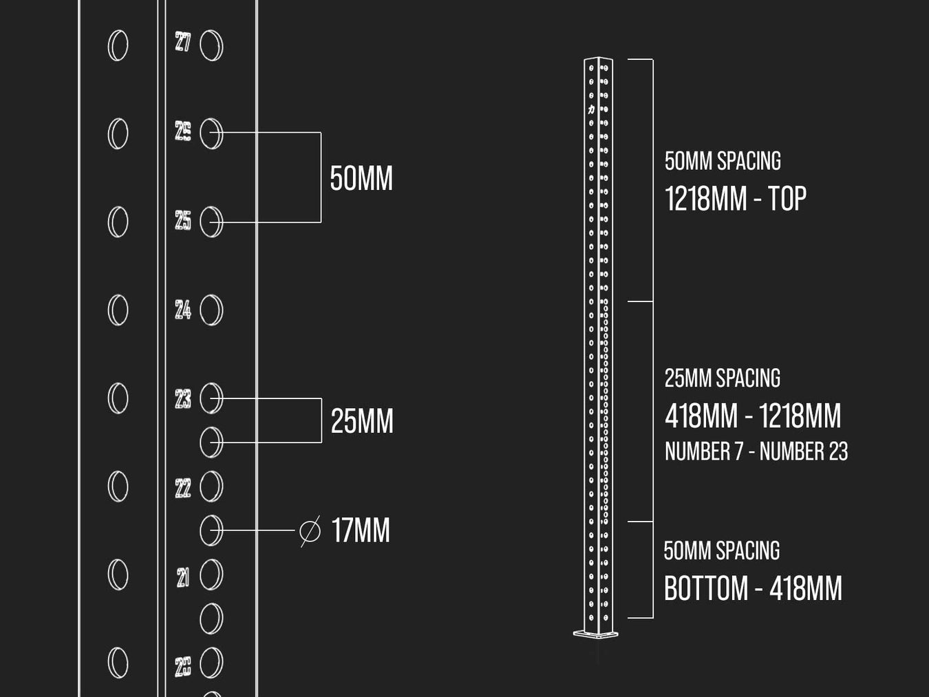 ‘Westside’ hole spacing (positions 7-23): 25mm centre-to-centre, front and back, located 418mm to 1218mm from the floor