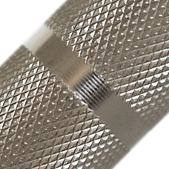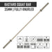 The deep, coarse knurling helps to get a solid grip. For easy orientation the bar comeswith markings at 81cm, 43cm and one right in the centre. With a total length of 233cm this Bastard Squat Bar is shorter than our32mm Bastard Squat Barbut comes at the samesolid weight of 25kg. The loadable sleeve length is 43cm and itcan be loaded up to a whopping 450kg.